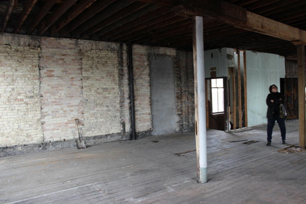 A woman in an abandoned looking house, taking in the view of the rooom.