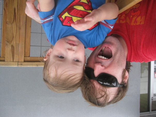 Man wearing sunglasses holding a toddler wearing a Superman shirt.