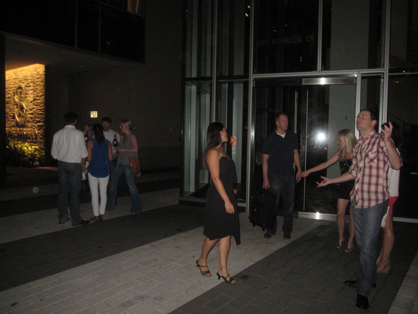 A group of people at night standing outside the glass door entrance to a building.