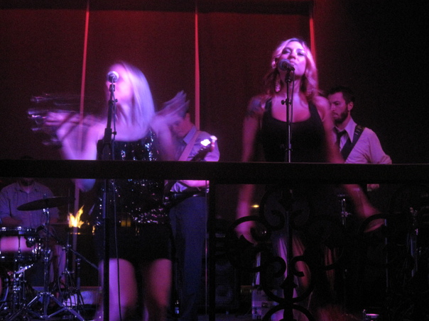 This appears to be a band playing at a dark indoor venue with two blonde females singing.