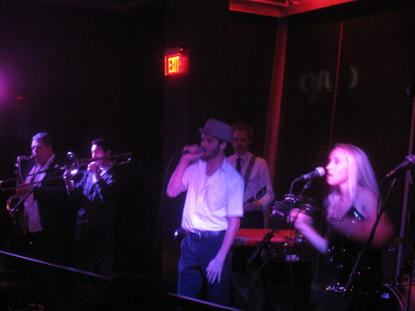 The band has two singers, a guitarist, a saxophone player and a man playing the trombone.