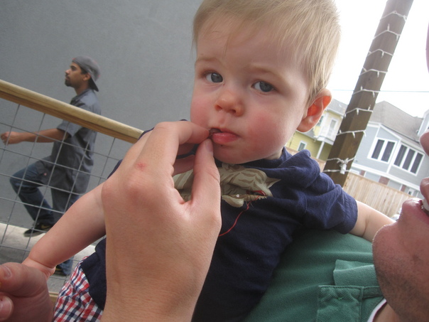A blonde child is being fed as he is being held by an adult.