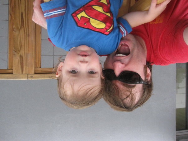 An upside down photo of a mother and child, in which the mother is very much excited