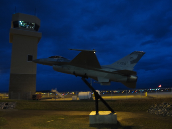 A model of an aircraft placed in front of the watch tower in an airtport. |
