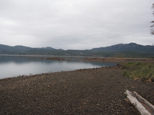 This is a landscape picture taken from the shore of a body of water with mountains in the background and a piece of wood in the foreground. |