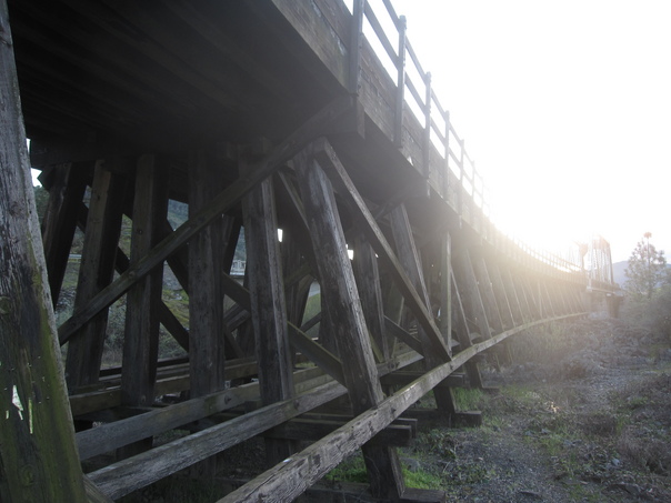 It is a bridge made of wood on a sunny day, it is over some grassy areas. |