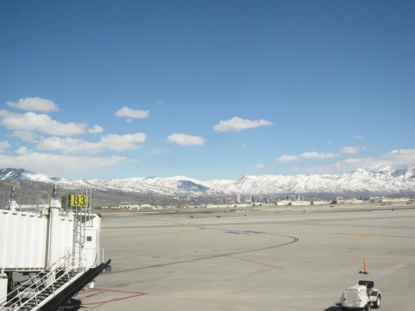 Fluffy clouds backdrop a concrete pad sandwiching snow cap mountains. |