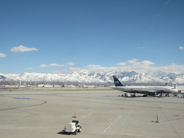 A clear view of a airport with a plane waiting with airport surrounded by hills. |