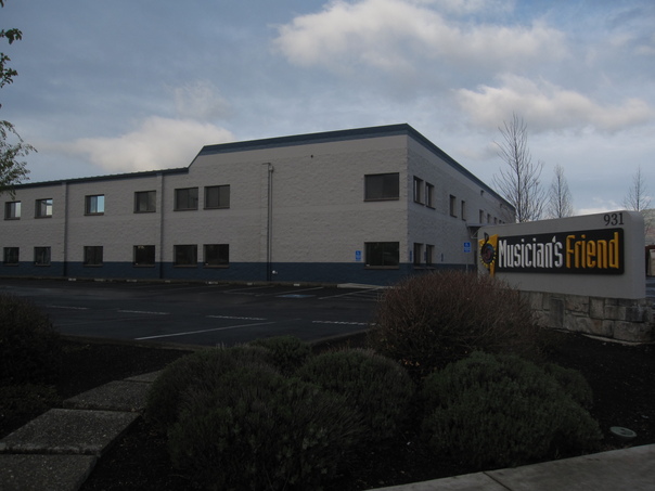 A large white and blue building surrounded by a black parking lot. |
