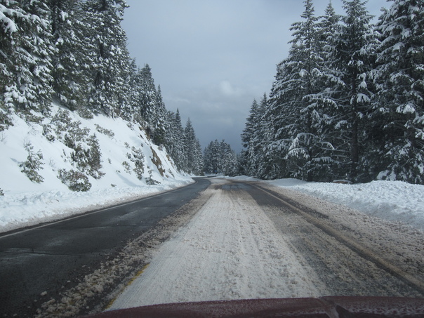 Hill area with full of snow in winter one car is going on road on winter we have to drive very carefully. |