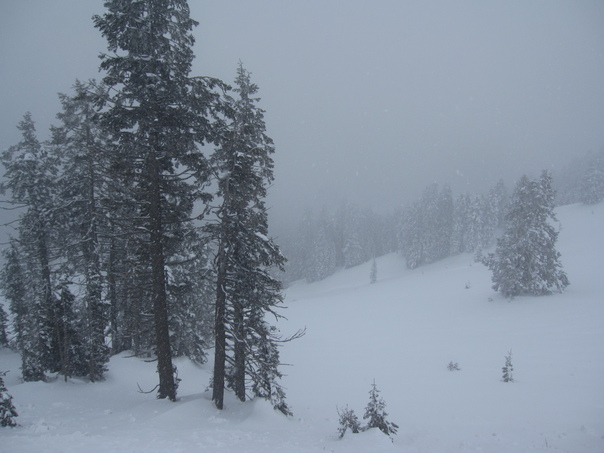 Snow has accumulated so high that it has almost buried some of the trees. |