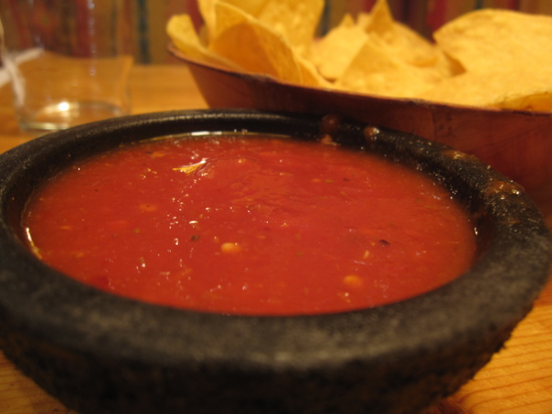 This is a picture of a bowl of salsa with chips beside it. |