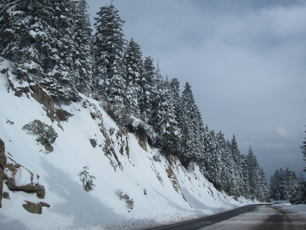This is a picture of a snow covered hill with a mass of bushes atop of it. |