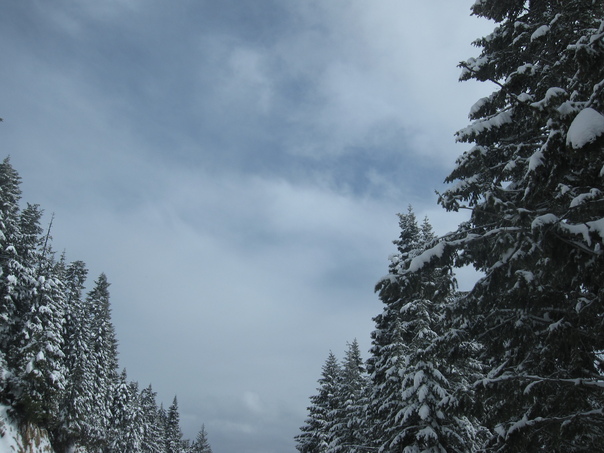 Tall trees in a row on both sides covered with snow facing high towards sky. |