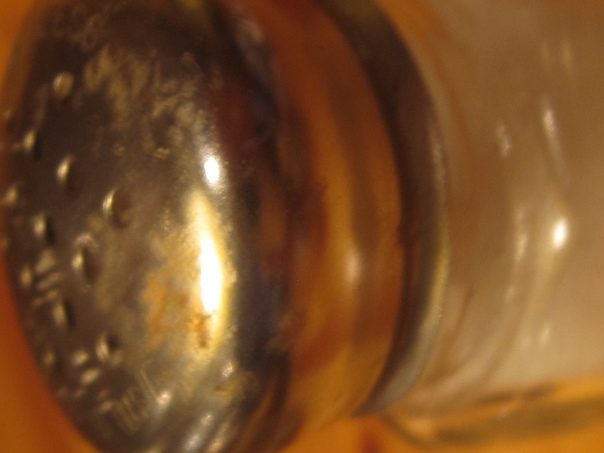 A closeup view of a salt bottle. Holes are on the top of the bottle. |