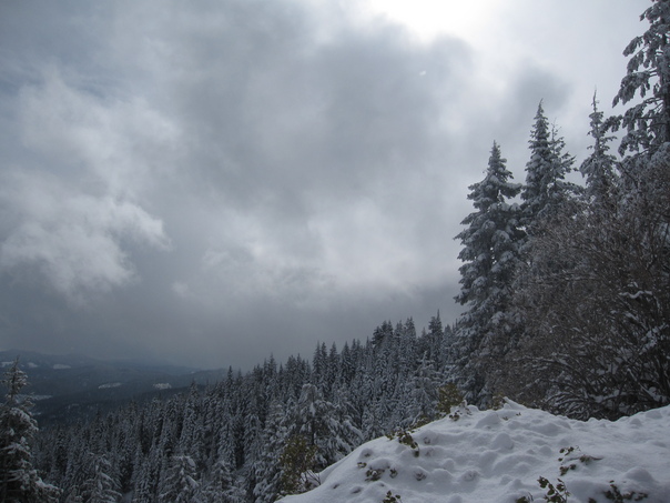 This is cloudly image and a snow is on the trees. |
