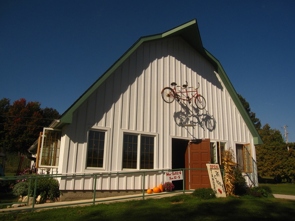 A bicycle built for two adorns this roadside cider and pumpkin stand.