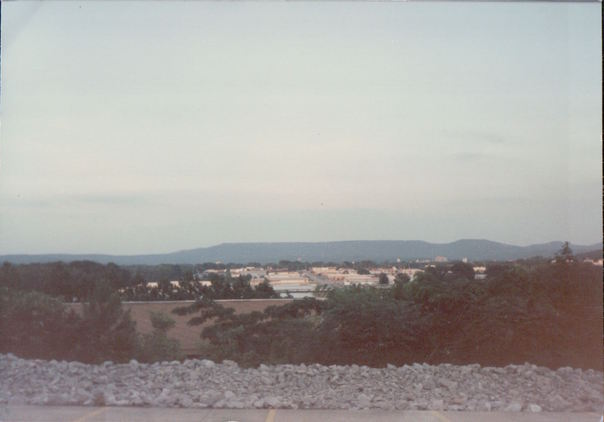 A low rocky wall separates a parking lot from a group of green trees and a taller wall beyond which a town and mountain range lie.