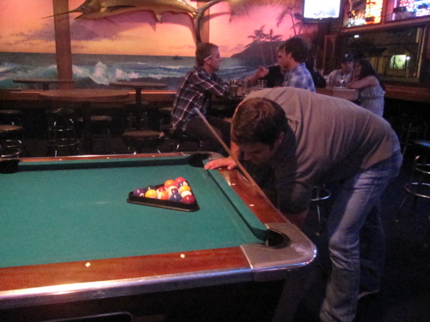 Several people sit around a bar-top table behind a pool table where a man is setting up to play.