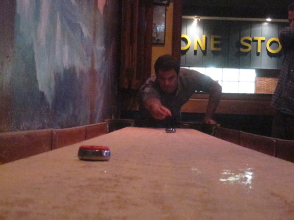A man leaning over a shuffleboard table having just released a piece.