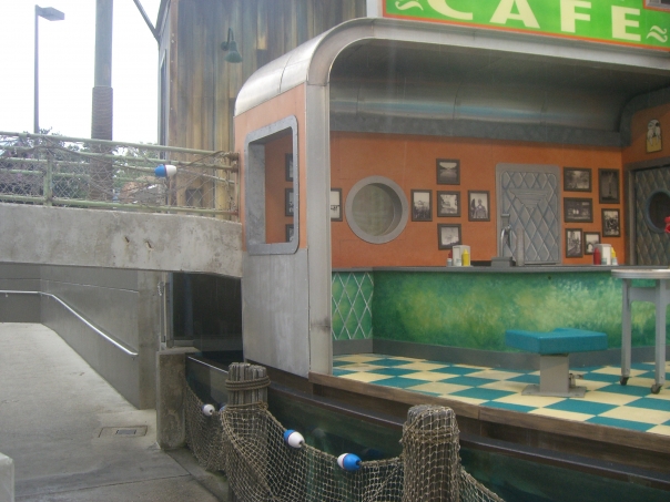 A blue, white, orange, and green cafe is surrounded by fishing netting.