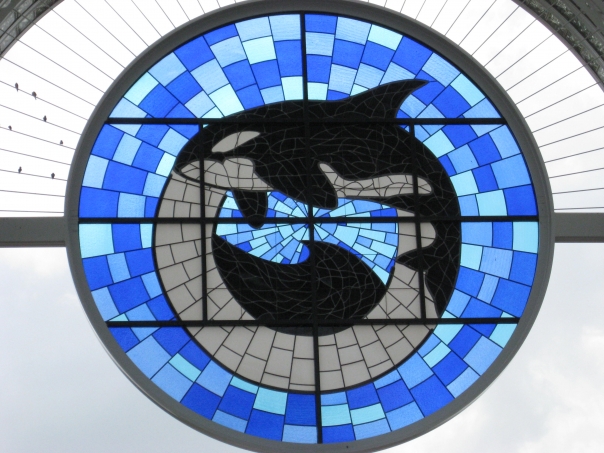 A mosaic of blue, black, white, and gray glass tiles set within a window depicts a killer whale.