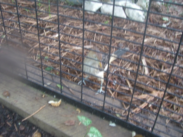 A strange little bird stands at the edge of a cage and tries to get scraps from the people looking at him.