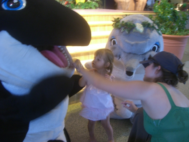 A slightly scarred toddler is being confronted by a large stuffed killer whale, while her mother tries to comfort her & show the whale to the little girl.