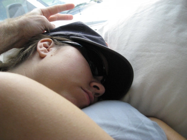 a sleepy girl on the bed