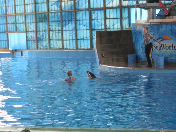 Trainers at SeaWorld work with a seal in the sparkling waters of the exhibition pool.