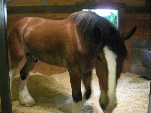 The brown and white horse is standing inside it's stable when this picture was taken.