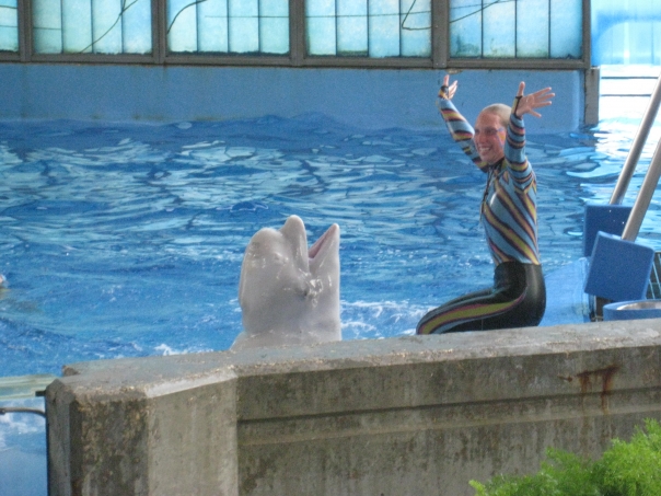 Marine trainer and dolphin celebrate a successful performance in pool.
