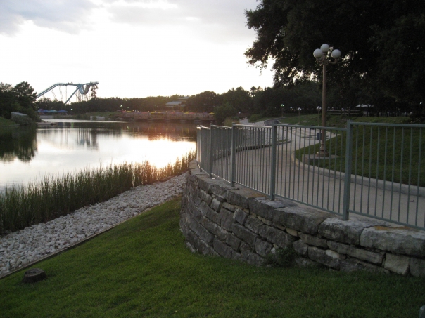 A walkway and a lake are shown at a large amusement park as the sun sets on another fun day.