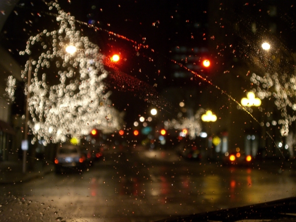 Street lights and string lights in trees are blurry past a rain-dotted windshield at night.
