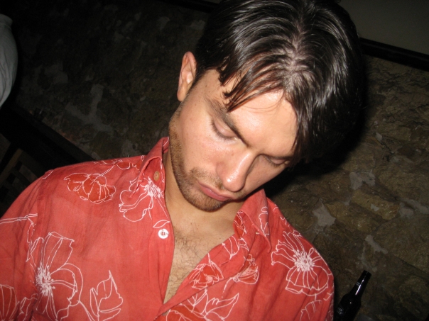 A man in an orange Hawaiian shirt with brown hair is looking down at something