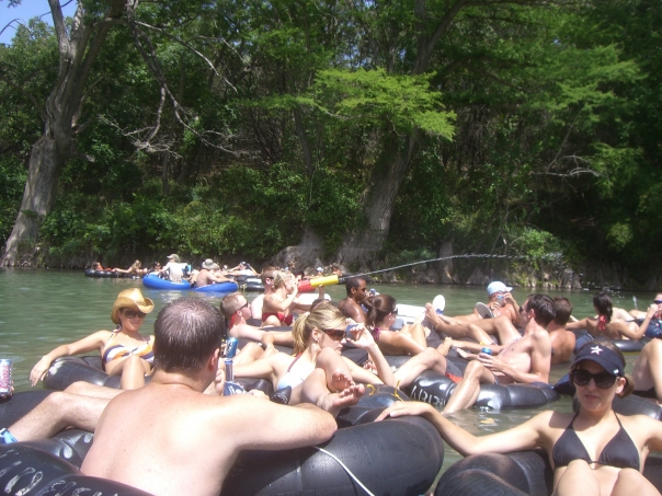 Dozens of college age men and women floating on lashed together inner tubes and wearing bathing suits in the sunshine.
