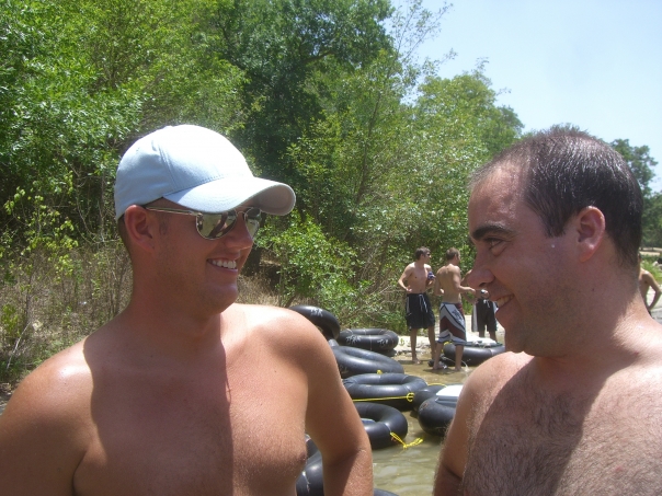 Two adult males who are smiling and staring at each other's while standing in a riverbed with inflatable tubes behind them.