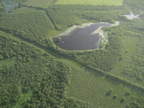A very large body of water surrounded by a forest of green trees.