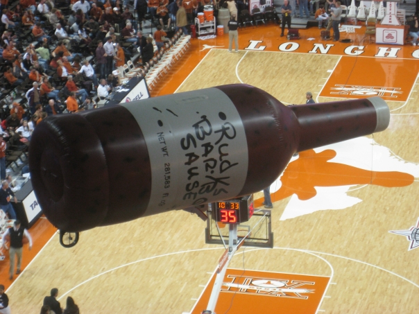 Barbecue sauce bottle hovering over basketball court Texas Longhorns brown