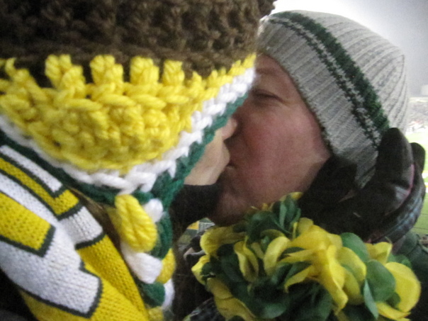 A woman dressed in the green and yellow colors of the Green Bay Packers kisses a man.