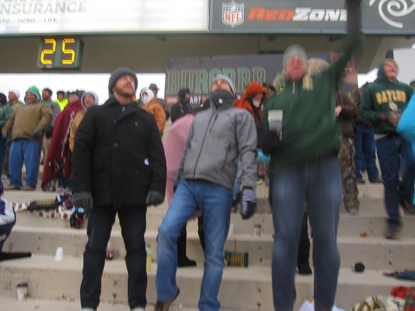 Three enthusiastic football fans cheer on their team at an NFL game on a cold winter day.