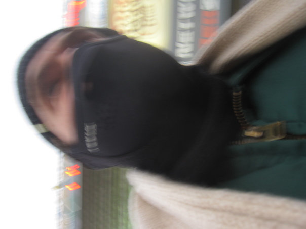 I man is wearing a blue jacket and a black cloth covering everything except his eyes.