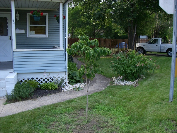 This shows the corner of a blue house with a part of a nice, manicured yard with a walkway and bushes and trees and nice green grass.
