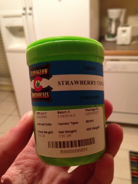 Someone is holding a green and white jar in their hand with the word strawberry on it