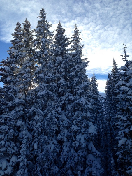 Very gorgeous view of some very tall snow covered trees and a slight glimpse of the sun peeking through.