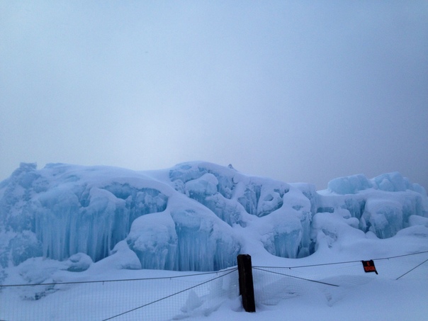 A snow and ice covered landscape behind a fence on a cloudy day.