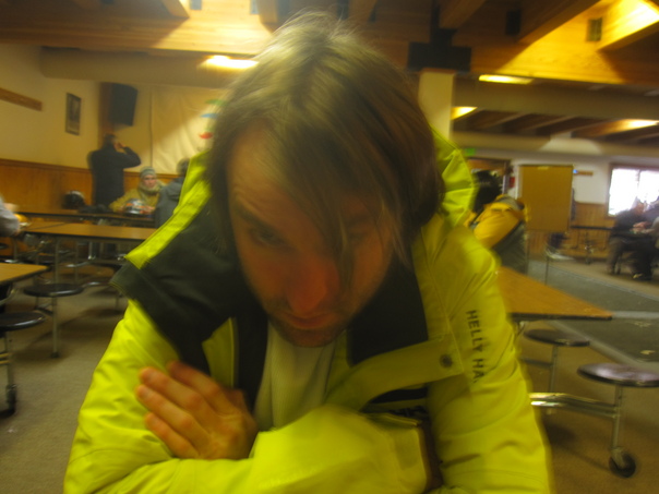 An overeducated, single, bored, middle-aged man, enjoying a break from his factory job where his work is performed in less than freezing temperatures in a walk-in cooler.