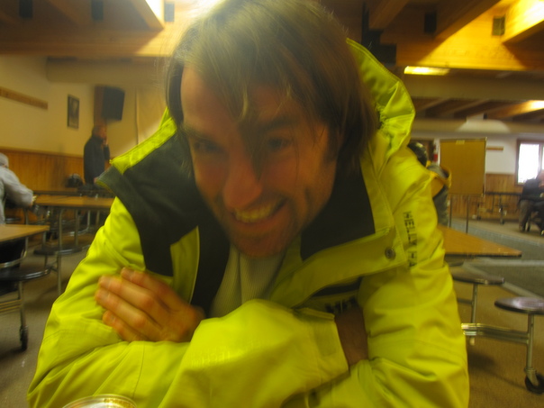 A man is smiling very big in a cafeteria, he is wearing a bright green jacket.