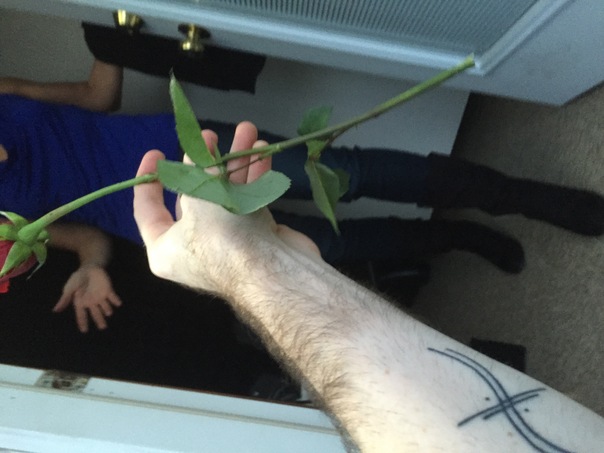 The girl that is being presented with the rose is wearing a blue shirt and has black boots over her jeans.
