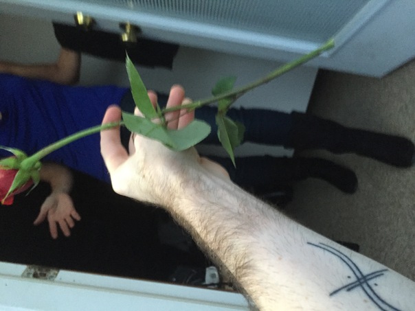 A man with a tattoo in his arm is offering a red rose to someone in a blue shirt.